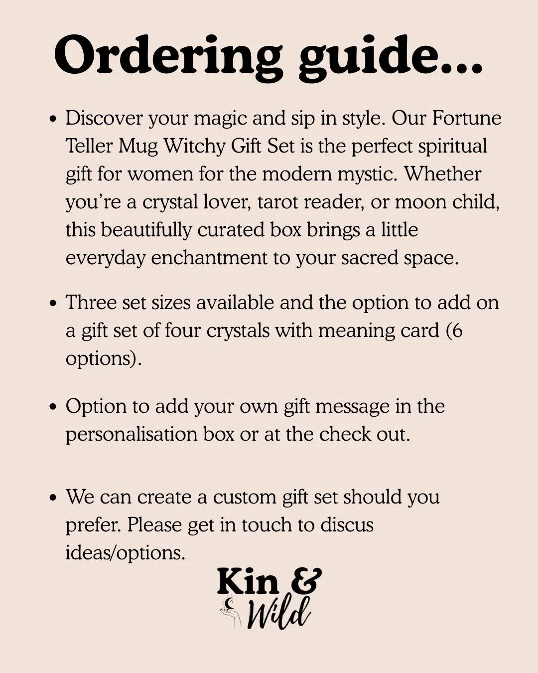 ✨ Discover your magic and sip in style. Our Fortune Teller Mug Witchy Gift Set is the perfect spiritual gift for women for the modern mystic. Whether you’re a crystal lover, tarot reader, or moon child, this beautifully curated box brings a little everyday enchantment to your sacred space. Ideal if you're looking for crystal gifts, witchy gifts, tarot gifts or a set to elevate your space, our boxes are ready to gift.