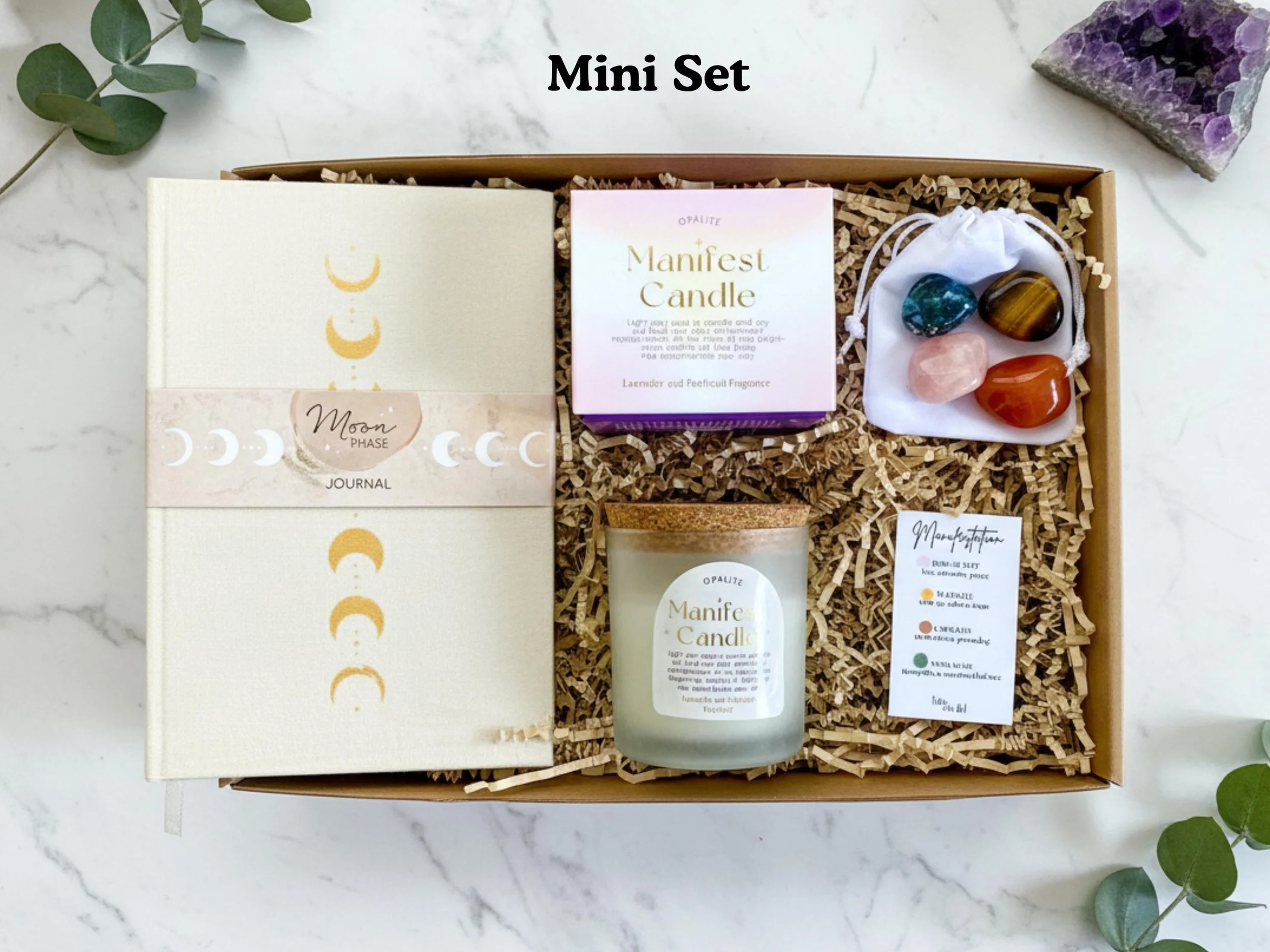 - Includes a moon phases journal, crystal candle, and crystals with meaning card