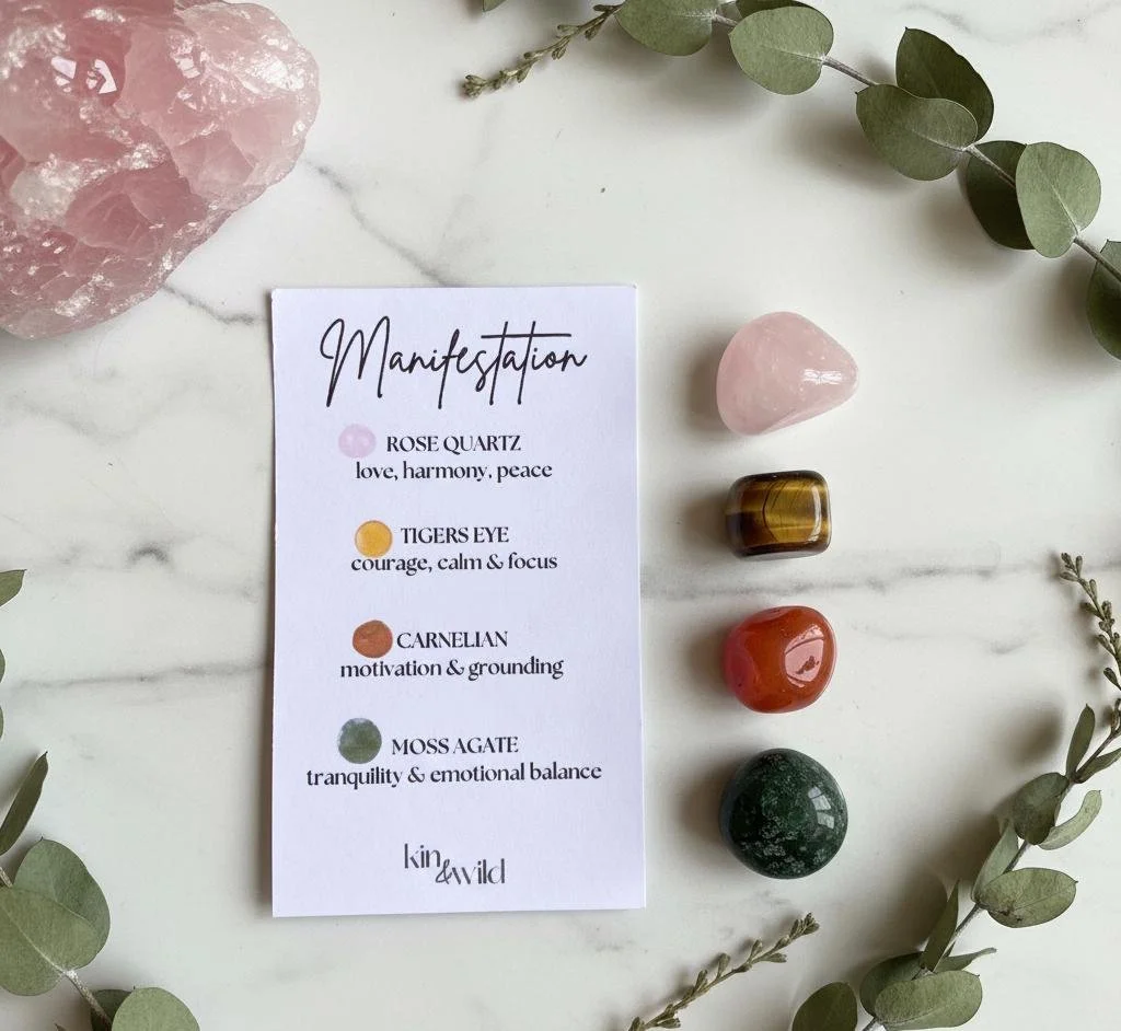 - 1 x Set of 4 Crystals in a velvet gift bag — choose from six energy themes (such as Self-- Love, Manifestation, Trust in the Universe & more).